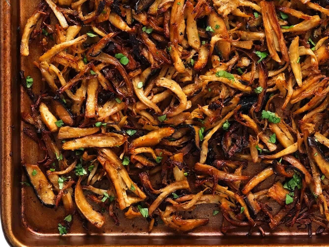 This fun mushroom “carnitas” recipe is easy make with marinated shredded mushrooms that are roasted to crispy, juicy, delicious perfection! Vegetarian, vegan, gluten-free, and perfect for tacos, burritos, quesadillas and more.